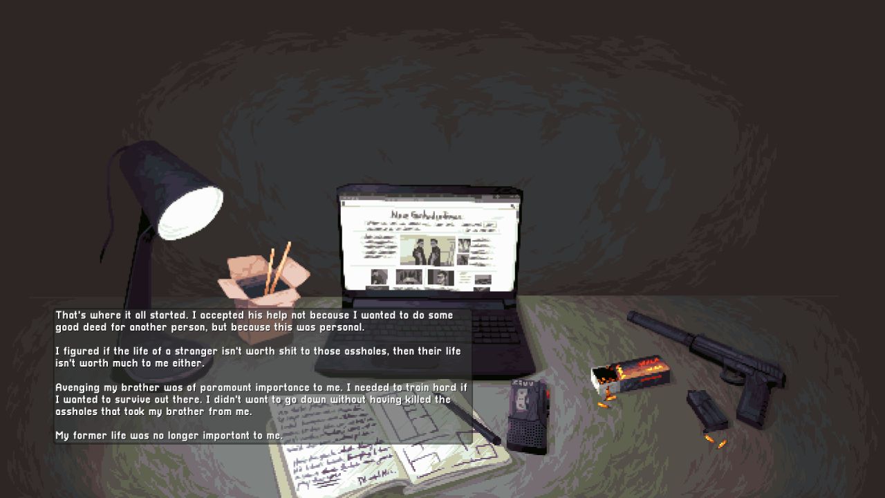 The story starts with you and your brother going to a bar; on the way back from the bar, you get jumped by some junkies and beaten up badly. Your brother ends up in a coma and dies a day later. Police don’t do much, so your mission is to avenge your brother. I (character Steve) start the hunt with the words, “This one is for you, big brother,” which perfectly sets the tone for the first mission. And the first mission is, you guessed it right, to kill the junkie’s leader.