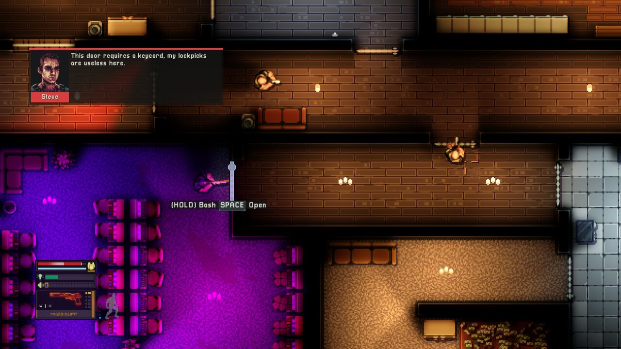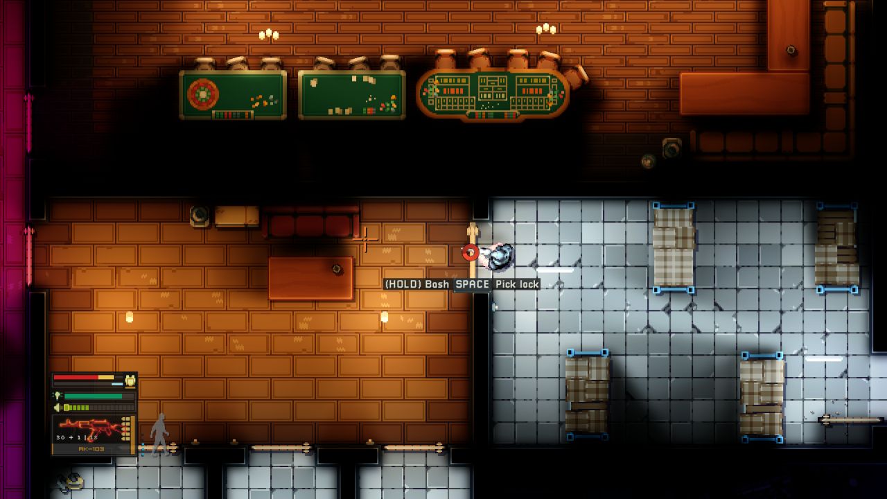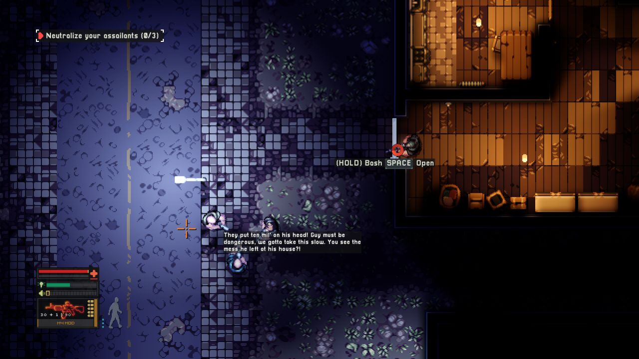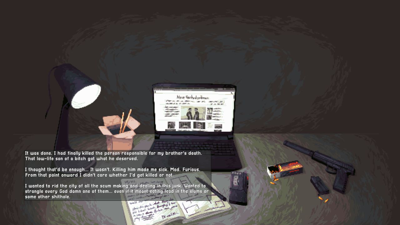 As I started the first mission, I tried the stealth approach, which I quickly abandoned since I was detected rapidly trying to hide the body in a dumpster, so it quickly turned into a gunfight. I died a few times on the first level since I chose the most challenging mode. I highly advise against this if you are new to the genre. After murdering about a dozen of the junkies, I did not find the main guy, so the story continued. Worth noting was that the first mission’s name was Druggie Ghetto, which I found hilarious.
