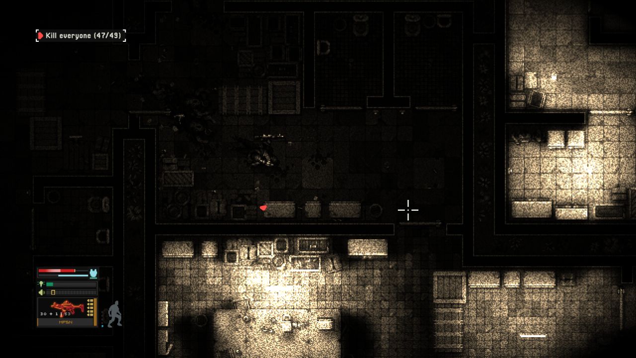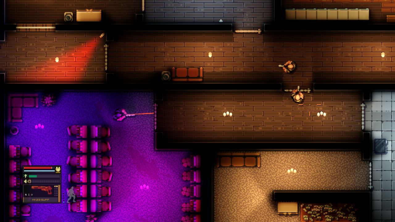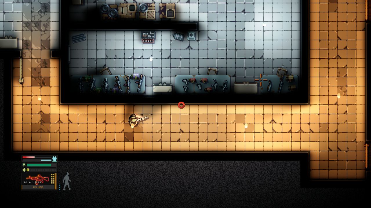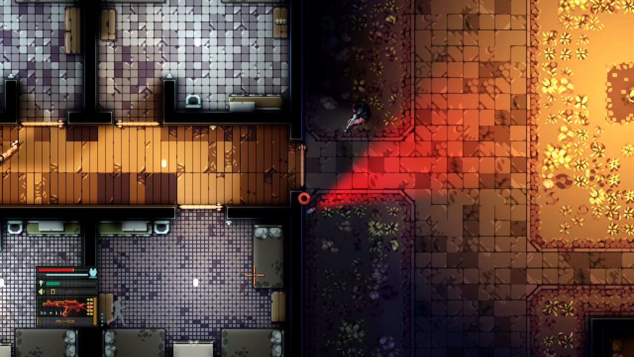 The controls are intuitive: WASD to move, and the mouse to aim and shoot. You can also control your walking speed with the mouse wheel, and there’s a laser aim on right-click. This feature is essential for targeting lamps, cameras, and similar environmental objects, and it’s handy in situations where you need to aim through windows and such.